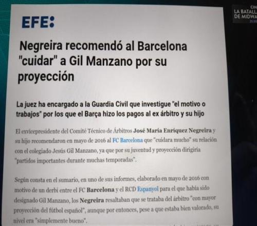 針對主裁判曼薩諾,皇馬電臺還公開曬出了此前內格雷拉案的一份法庭報告,指出曼薩諾有傾向巴薩的嫌疑。在這份法庭報告中,前裁判技術委員會副主席內格雷拉承認自己收了巴薩的錢,并向巴薩提出建議,希望他們和曼薩諾搞好關系。
