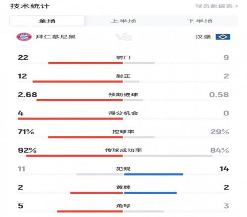 直播吧9月14日訊 德甲第3輪,拜仁主場5-0擊敗漢堡,兩隊全場比賽數據如下(主隊拜仁在前):射門:22-9射正:12-2預期進球:2.68-0.58得分機會:4-0控球率:71%-29%傳球成功率:92%-84%犯規:11-14黃牌:2-2角球:5-3